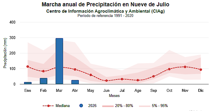 Precipitaciones en la localidad de Nueve de Julio, provincia de Buenos Aires. La línea roja representa valores de referencia entre 1991 y 2020. Fuente: CIAg
