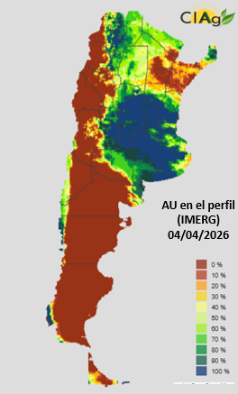 Agua útil (%) en el perfil del suelo en todo el país, al 4 de abril de 2026