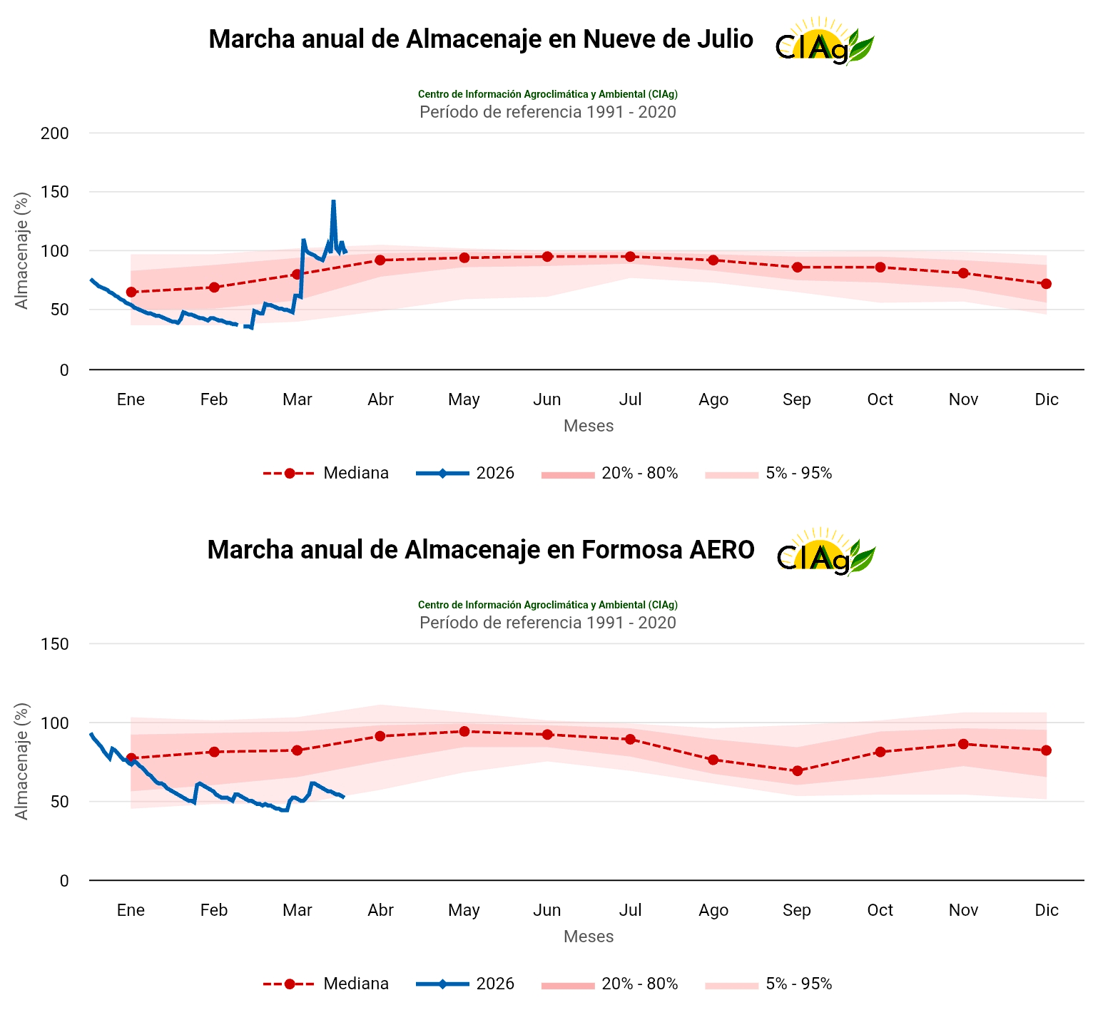 Evolución del almacenaje de agua en el suelo en Nueve de Julio (Bs. As., panel superior) y en Formosa (Formosa, panel inferior). La línea roja representa valores de referencia entre 1991 y 2020 en ambas localidades. La línea azul representa valores entre enero y mediados de marzo de 2026