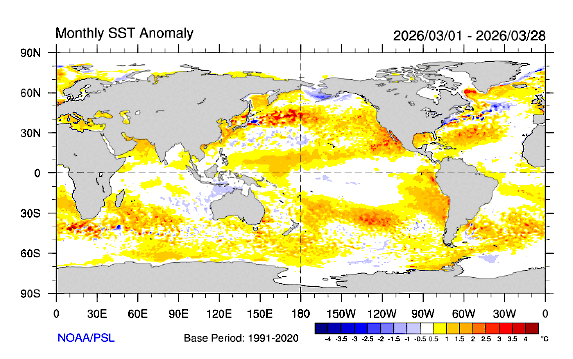 Promedio de las variaciones de las temperaturas de las aguas superficiales (SST) en la zona central del Océano Pacífico Ecuatorial entre el 1 y el 28 de marzo de 2026. Fuente: NOAA