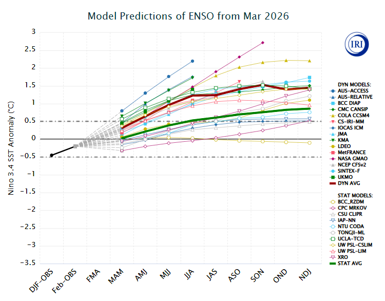 La docente señaló que la mayoría de los modelos dinámicos analizados a mediados de marzo prevén que las temperaturas superficiales del mar en esa región del Pacífico continuarán aumentando durante los próximos meses. Alcanzarían valores superiores a los normales durante el trimestre abril-mayo-junio.