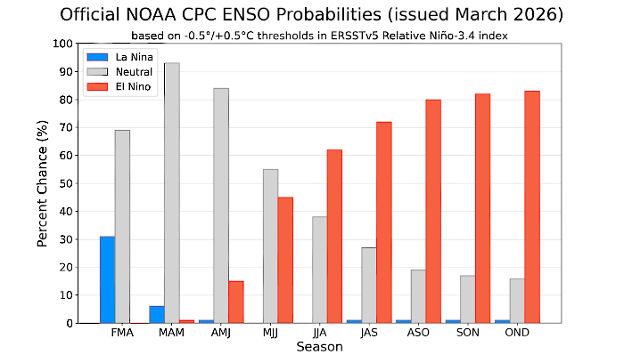 En este marco, Fernández Long resaltó que el Climate Prediction Center estimó que desde mediados de marzo, el Pacífico Ecuatorial está en transición desde condiciones Niña en debilitamiento hacia la neutralidad.
