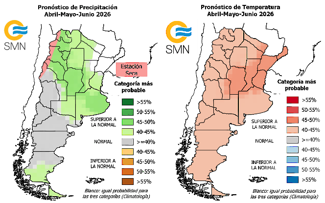 Pronóstico de precipitación y temperatura para el trimestre abril, mayo y junio de 2026. Fuente: Servicio Meteorológico Nacional